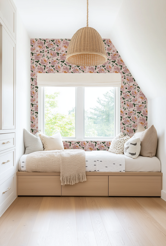 Keywords: Pink floral wallpaper, romantic peony wallpaper, blush botanical wallcovering, soft watercolor wallpaper, vintage-inspired wallpaper, feminine cottagecore décor, nursery floral wallpaper, classic floral statement wall, dreamy botanical interiors.