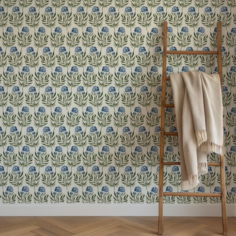 Inspired by the charm of traditional folk art, the Folk Floral Wallpaper in Blue brings a fresh yet timeless elegance to your interiors. This captivating design features hand-painted red florals with lush green foliage, beautifully set against a deep blue backdrop. The rich contrast and intricate botanical details make this wallpaper a perfect choice for those who appreciate vintage aesthetics with a modern twist.
