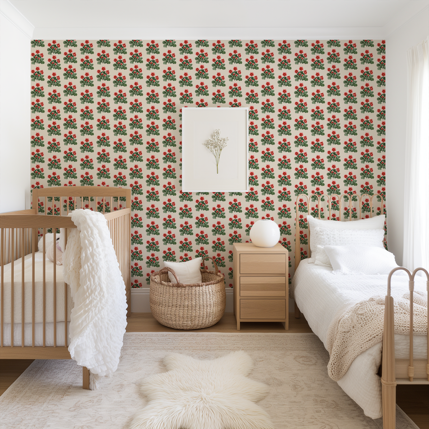 Keywords: green floral wallpaper, folk print wallpaper, vintage botanical wallpaper, cottagecore wallpaper, farmhouse wall décor, block print wallpaper, red and green floral wallpaper, cozy kitchen wallpaper, heritage wallpaper